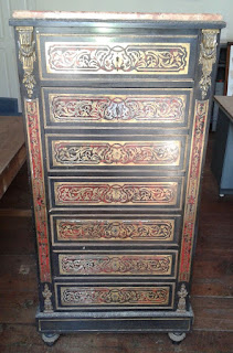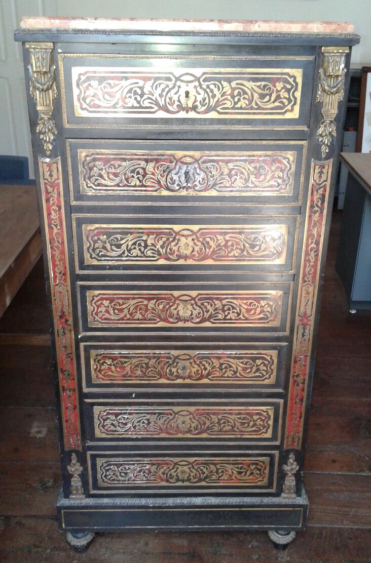 La técnica decorativa con la que está realizado, recibe el nombre de Boulle, debiendo su nombre precisamente a su primer artífice André-Charles Boulle, ebanista del rey Luis XIV, y quien crearía una técnica de marquetería a base de metales (cobre, estaño, latón) combinados con materiales orgánicos (carey, madre-perla, marfil). En este caso, latón y carey sobre fondo negro y con tapa de mármol rosado.Pues bien, cuando este mueble llegó al taller, el mayor problema que presentaba era el ataque de insectos xilófagos, con lo que el primer paso a realizar fue todo el proceso de desinsectación, en este caso combinando insecticida con un envoltorio al vacío (anoxia). Tras un periodo de 15 días, repetimos el tratamiento. Una vez finalizado este proceso, nos dedicamos a reconstruir las zonas que los insectos había devorado: sobre todo patas y bajos. También tuvimos que rellenar infinidad de agujeros de salida de los insectos, concentrados en su mayoría en la trasera.